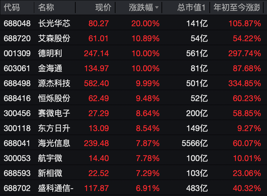 今天上午,大科技行情回归!半导体板块普涨,光模块(CPO)领涨市场,存储芯片板块多股上扬,半导体行情成为市场焦点。个股方面,长光华芯录得20cm涨停,德明利、金海通录得10cm涨停。中芯国际涨近4%,海光信息涨超7%,源杰科技、艾森股份、赛微电子、东方日升跟涨。