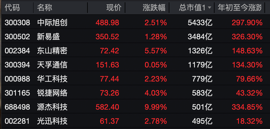 寒武纪大涨6%,现报1429.34元/股,最新市值为6027亿元。CPO板块走强,“易中天”股价拉升。截至午盘,中际旭创、新易盛、天孚通信涨幅分别为2.51%、1.28%、0.05%,CPO板块表现抢眼。