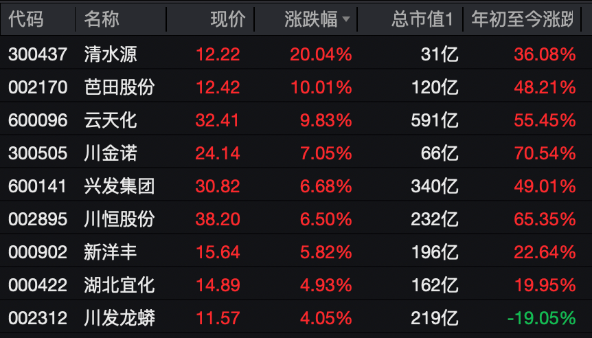 今日上午,磷化工板块集体爆发,成为市场另一大亮点。个股方面,清水源、芭田股份、澄星股份、云天化均涨停,磷化工板块个股表现强势。