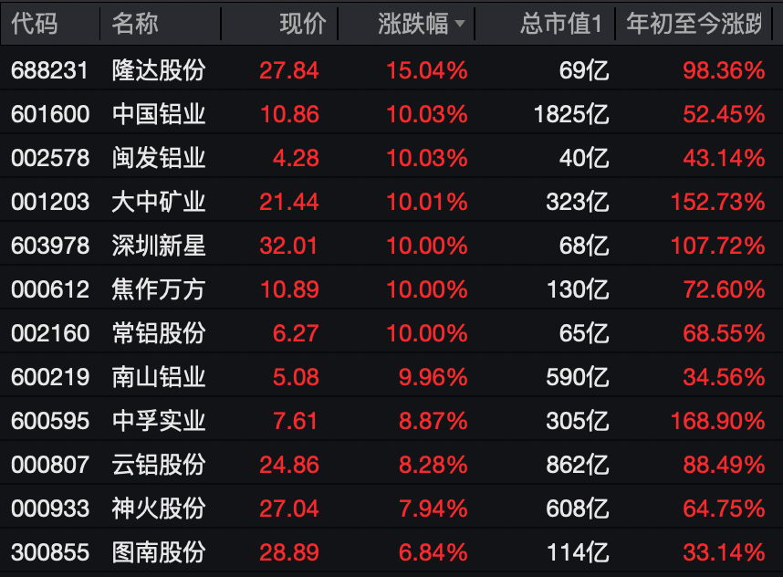 上午,A股有色板块震荡走强,相关个股掀“涨停潮”,有色板块成为市场热点。个股方面,深圳新星一字涨停,闽发铝业、常铝股份直线涨停,中国铝业10cm涨停,大中矿业、焦作万方、南山铝业纷纷涨停,有色板块个股表现抢眼。