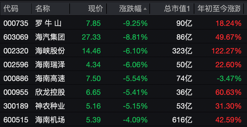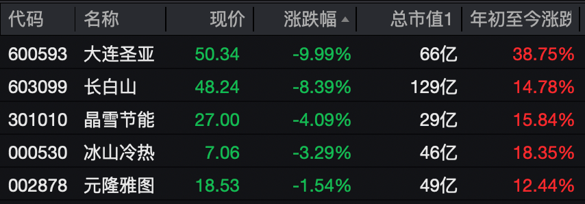 冰雪产业板块集体调整,大连圣亚跌停,长白山、凯撒旅业、晶雪节能跟跌,市场热点切换明显。海南自贸区板块同样大幅回落,海汽集团盘中一度跌停,罗牛山、海峡股份、海南瑞泽跌幅居前,市场板块轮动加快。