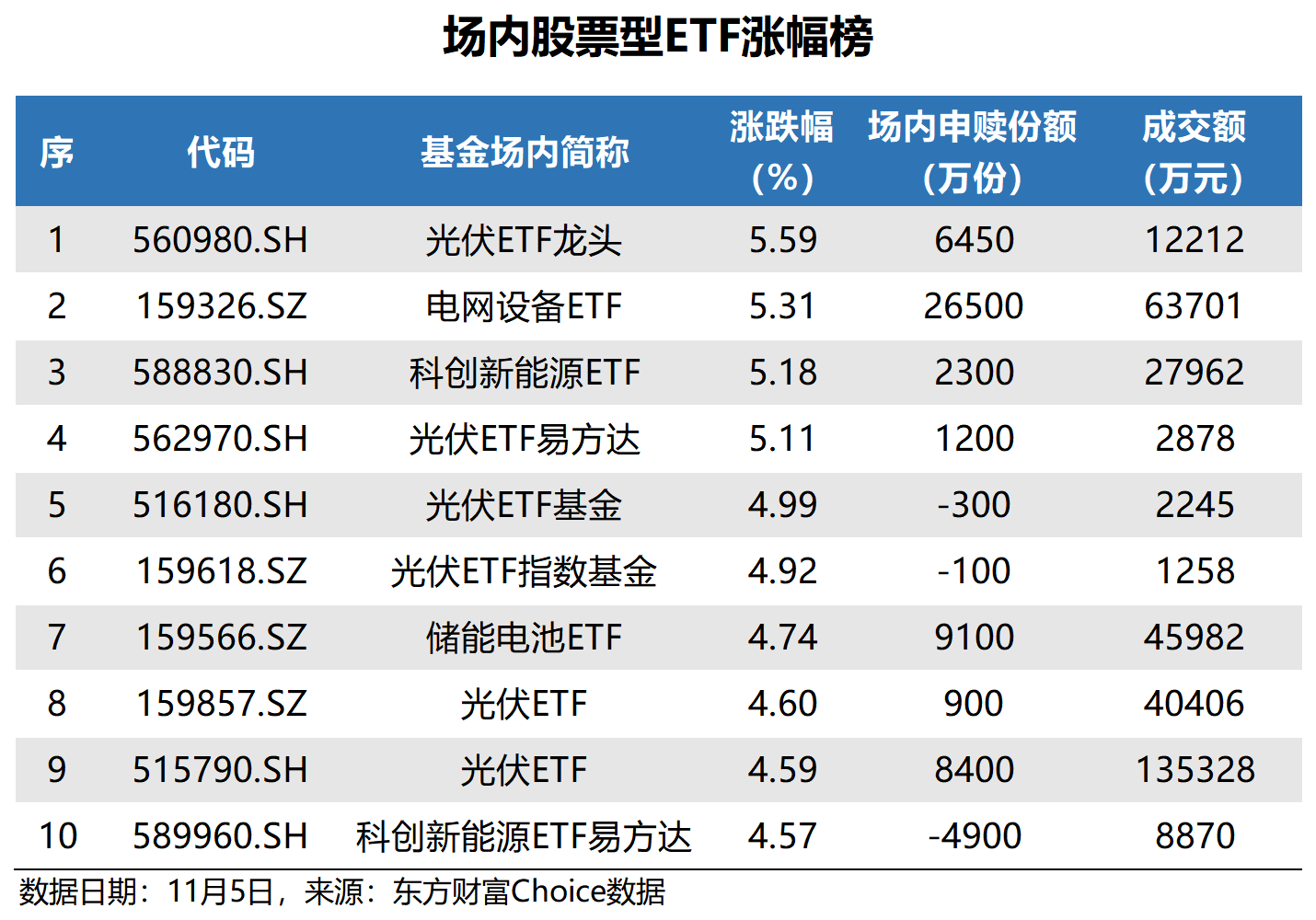 11月5日股票型ETF申赎动态:光伏ETF领涨,A500ETF南方获青睐