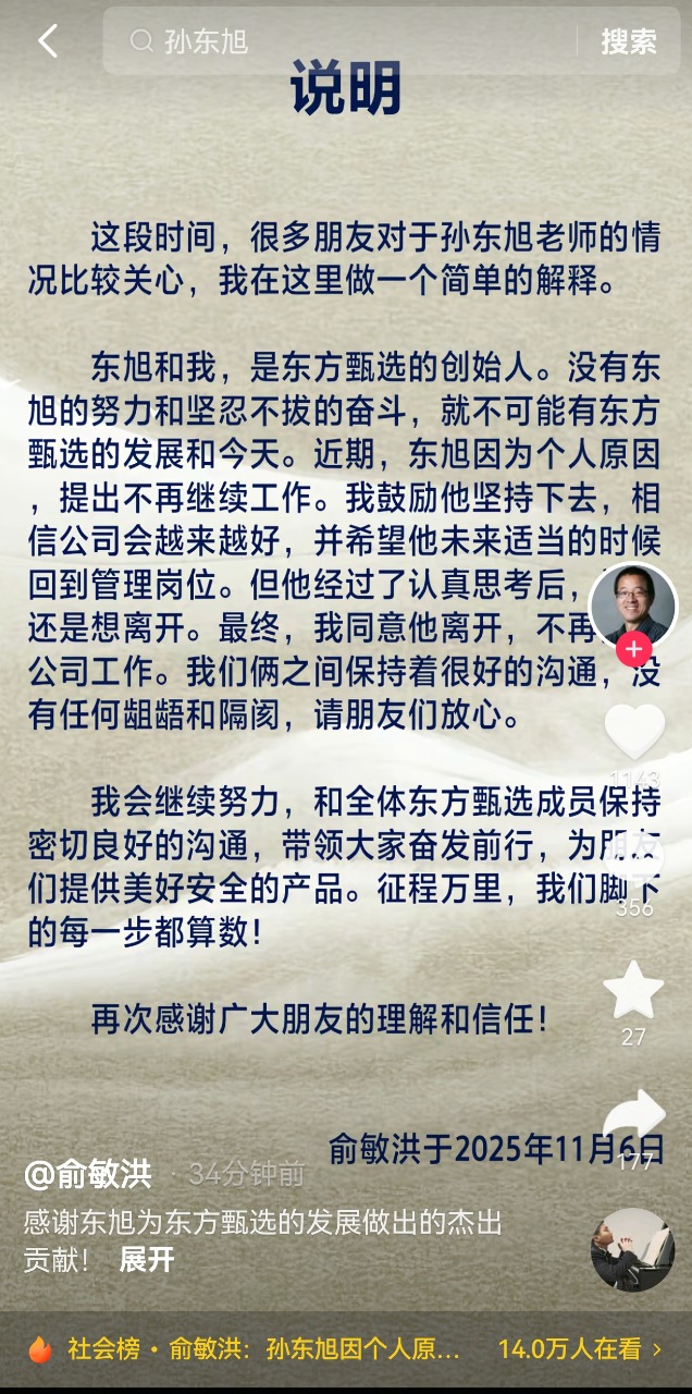 11月6日下午,新东方创始人俞敏洪在抖音平台发布说明称,近期,东方甄选前CEO孙东旭因个人原因,提出不再继续工作,俞敏洪最终同意其离职决定,不再参与公司运营。这一变动引发市场对东方甄选管理层的持续关注。俞敏洪表示,“我鼓励他坚持下去,相信公司会越来越好,并希望他未来适当的时候回到管理岗位。但他经过了认真思考后,决定彻底离开。”
