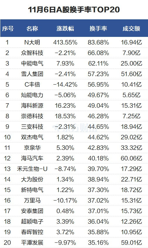 当天换手率最高的个股为N大明,全天换手率高达83.68%,显示出市场对该股的极高关注度。众智科技紧随其后,全天换手率66.08%,同样表现出色。这些高换手率的个股,往往成为市场热点的风向标,引领着市场的投资方向。
