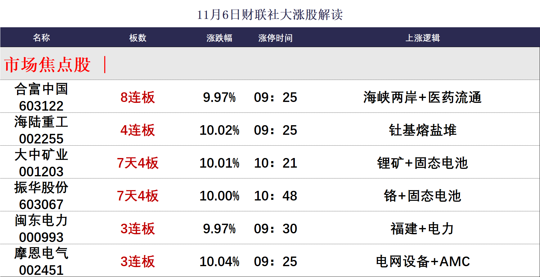 财联社11月6日讯,今日62股涨停,33股炸板,封板率为65%,合富中国8连板,海陆重工4连板,摩恩电气、闽东电力3连板,大中矿业、振华股份7天4板,联德股份6天3板。市场全天震荡走强,沪指放量涨近1%重回4000点,沪深两市成交额2.06万亿,较上一个交易日放量1829亿,市场资金活跃度显著提升。盘面上,市场热点快速轮动,全市场近2900只个股上涨。板块方面,磷化工、半导体、CPO等板块涨幅居前,海南、影视院线、旅游及酒店等板块跌幅居前。截至收盘,沪指涨0.97%,深成指涨1.73%,创业板指涨1.84%,市场整体呈现普涨格局。