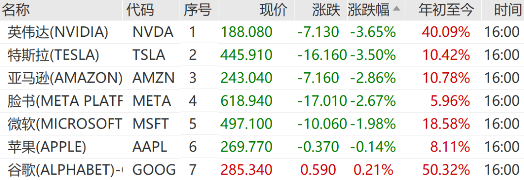 万得美国科技七巨头指数一度大跌2.12%,收盘时跌1.91%。美国科技七巨头几乎全线下跌,英伟达跌3.65%,特斯拉跌3.50%,亚马逊跌2.86%,领跌七巨头,仅谷歌微涨0.21%。