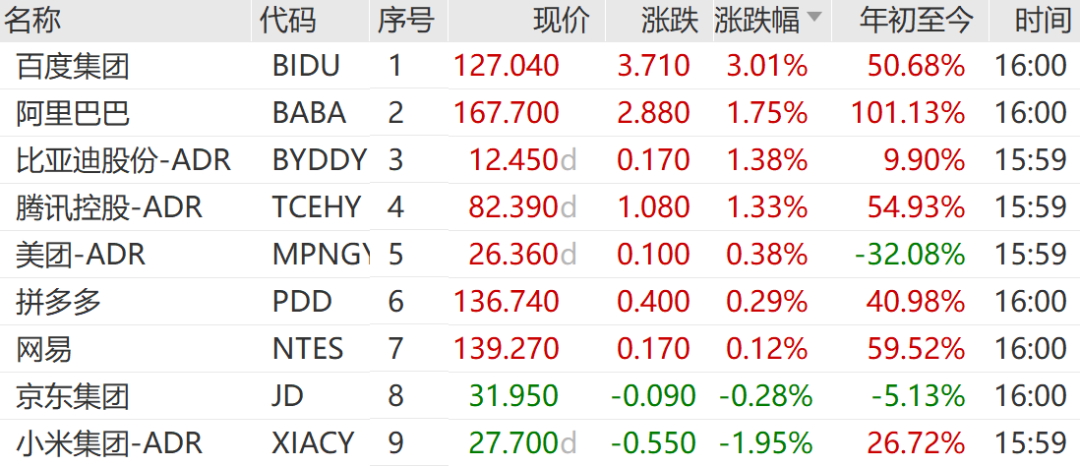 中概股明显跑赢大盘。万得中概科技龙头指数一度逆市大涨2.04%,收盘时上涨0.93%,纳斯达克中国金龙指数微跌0.03%。百度集团涨3.01%,阿里巴巴涨1.75%,比亚迪涨1.38%,领涨万得中概科技龙头指数成份股。今年以来阿里巴巴股价涨幅高达101.13%!