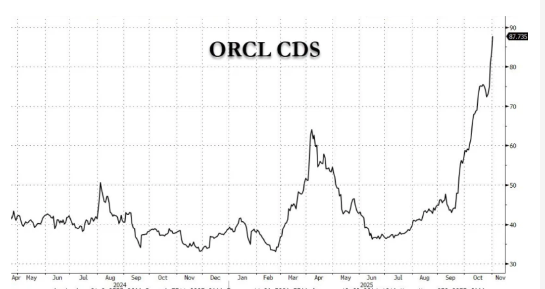 在2025年的前三个季度,甲骨文的信用违约互换(CDS)交易价格一直在30至45个基点之间平稳波动。随后在9月,CDS开始攀升,到该月底突破60个基点,并在10月进一步升至80个基点。11月初,这一水平达到87.735个基点的峰值——这是自2024年中期以来的最高水平。