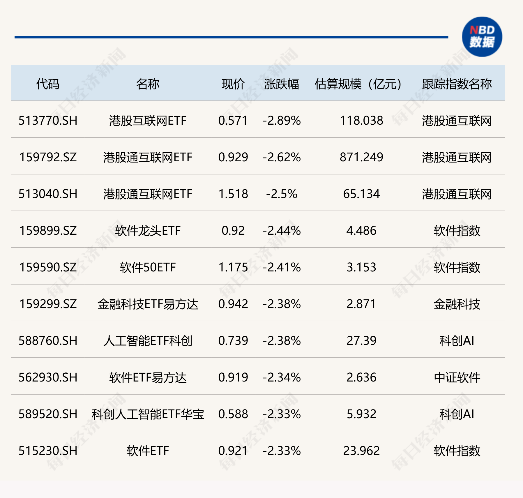 下跌方面,港股互联网相关ETF跌超2%,市场表现疲软。