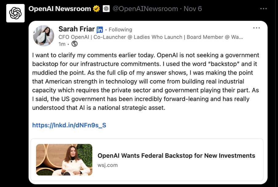 随后,弗莱尔也在社交平台发文澄清,称美国媒体的报道“模糊了重点”,OpenAI并不寻求政府为其基础设施投入提供担保。“我使用了‘后盾’这个词,从我回答的完整视频可以看出,我的核心观点是:美国在技术领域的实力来自建设真正的工业产能,而这需要私营部门和政府各司其职”。