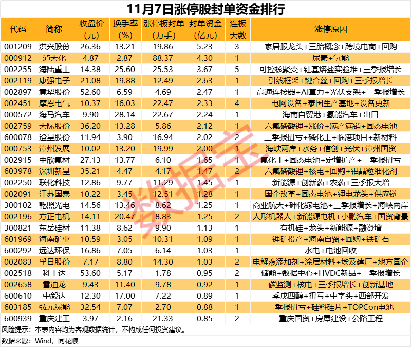 洪兴股份已实现3连涨停板,盘后数据显示,11月4日—6日两家机构专用席位净卖出,合计净卖出金额达到1830.74万元。公司在股票交易异常波动中表示,经核查,公司、控股股东和实际控制人不存在关于本公司的应披露而未披露或处于筹划阶段的重大事项。