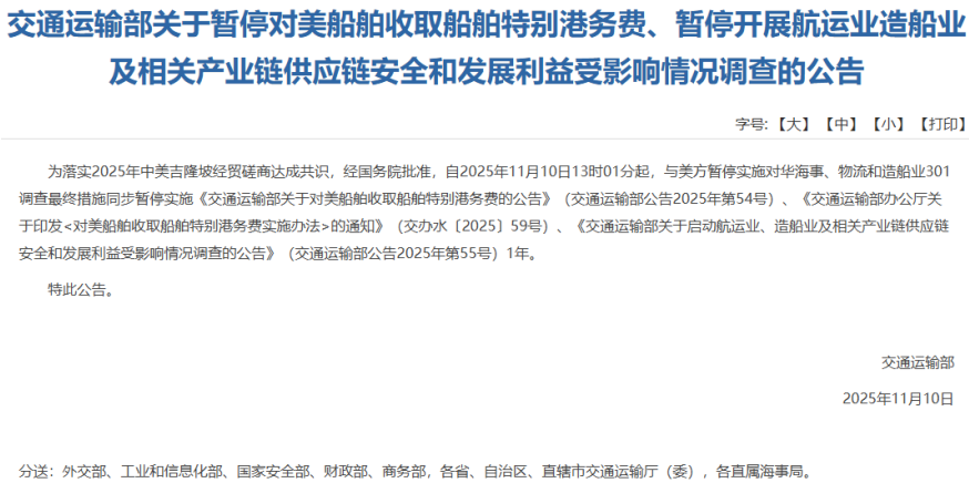 11月10日,交通运输部发布详细公告,为落实中美经贸磋商共识,自2025年11月10日13时01分起,与美方同步暂停实施多项针对华海事、物流和造船业的301调查最终措施及相关公告,暂停期为1年。美国贸易代表办公室也表示,该行动将暂停一年,自美国东部时间2025年11月10日凌晨12时01分起生效。此前,当地时间11月6日,美国贸易代表办公室已发布类似公告,暂停因“301条款”对中国采取的所有惩罚性措施。