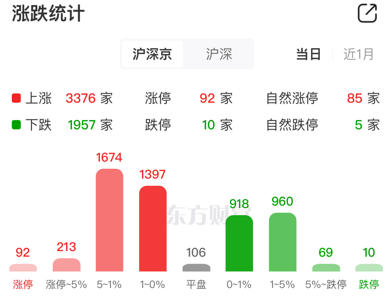 A股三大股指午后震荡回升,截至收盘,沪指涨0.53%,深成指翻红涨0.18%,盘中跌超2%的创业板指仍收跌0.92%。量能方面,两市全天成交2.17万亿元,较上一交易日放量1754亿元,市场活跃度显著提升。全市场近3400股飘红,92股涨停,封板率为64.34%,市场情绪回暖。
