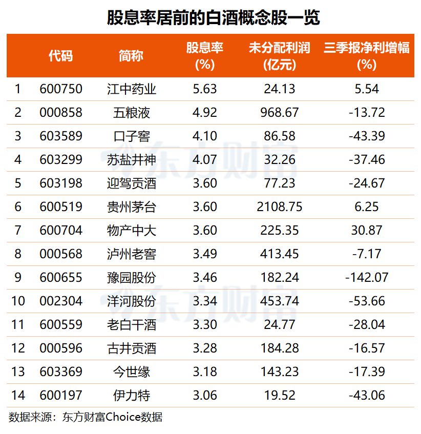 白酒概念股今日集体走强,舍得酒业、酒鬼酒午后双双涨停,会稽山、中锐股份强势封板,泸州老窖大涨超8%,山西汾酒、古井贡酒、金徽酒、迎驾贡酒等多股涨超5%,贵州茅台涨2%,白酒板块成为市场焦点。中金公司表示,2026年白酒报表有望出清改善,上行拐点逐步清晰;预计明年上半年开始行业开始迎来梯次修复,其中基本面率先修复且具有长期份额逻辑的龙头酒企获益最大。国金证券也指出,考虑到此轮周期的动销底逐步探明,表观业绩压力正加速释放,动销反馈环比持续改善确定性强、当下正值自上而下政策窗口期,看好白酒板块的配置价值。值得注意的是,尽管多数白酒股今年业绩不尽如人意,但股息率超3%的白酒概念股共14只,其中,贵州茅台、物产中大、江中药业三股均实现了前三季度归母净利润的正增长,白酒板块长期投资价值凸显。