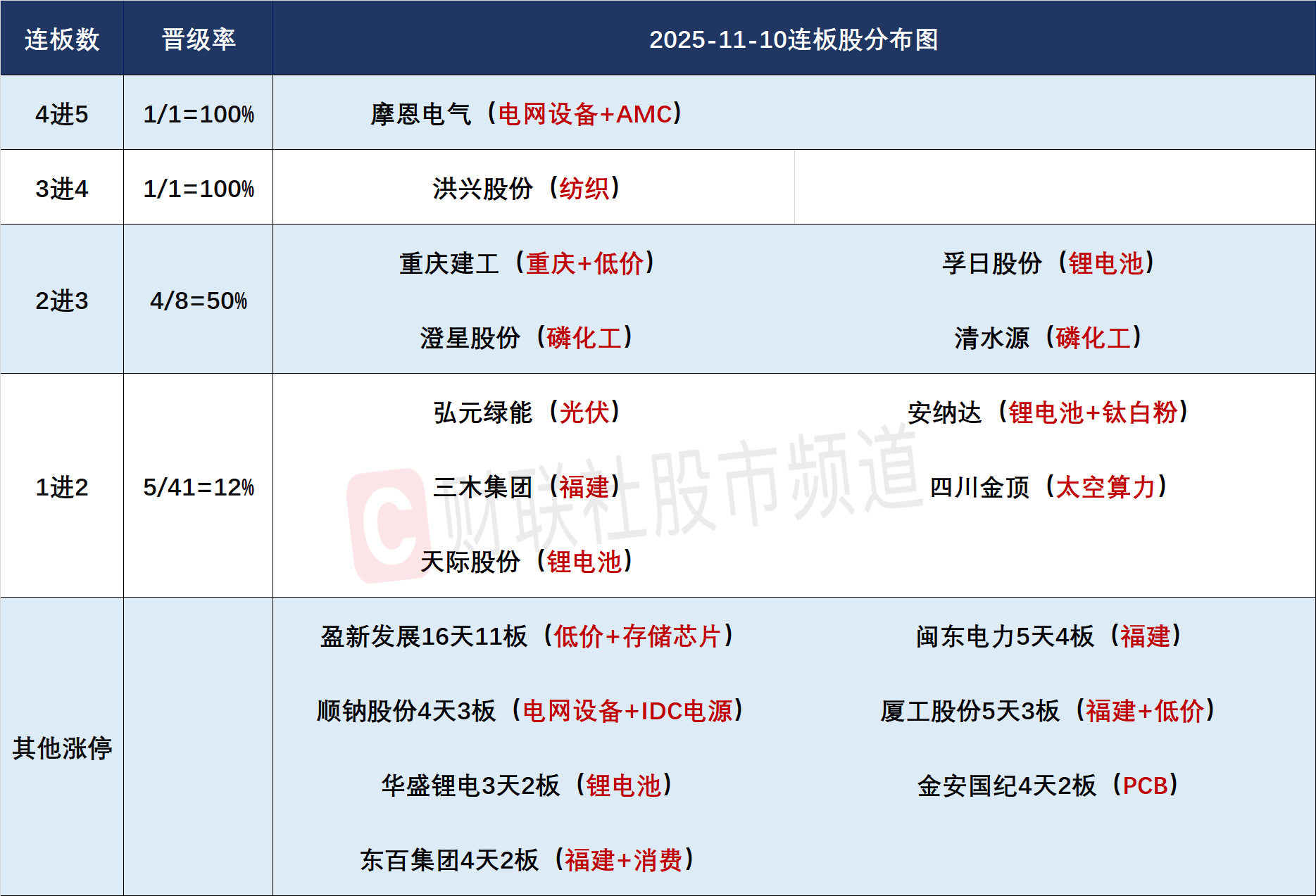 财联社11月10日讯,今日71股涨停,43股炸板,封板率为62%,摩恩电气5连板引领市场,洪兴股份4连板,清水源20cm3连板 ,重庆建工、孚日股份、澄星股份3连板,盈新发展16天11板,闽东电力5天4板。市场探底回升,三大指数涨跌不一,沪指午后翻红后震荡拉升,创业板指跌幅收窄,此前一度跌超2%。沪深两市成交额2.17万亿,较上一个交易日放量1754亿,市场活跃度提升。板块方面,白酒、旅游及酒店、免税店等板块涨幅居前,燃气、风电设备、机器人等板块跌幅居前。截至收盘,沪指涨0.53%,深成指涨0.18%,创业板指跌0.92%,市场整体呈现分化格局。