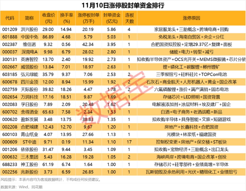 以封单金额计算,20股封单资金超过1亿元。其中,洪兴股份、中国中免、维信诺排名前三,金额依次为5.86亿元、5.03亿元、3.95亿元;深南电A、英唐智控、威领股份和弘元绿能封单金额在2亿元以上。洪兴股份是专注于家居服饰领域的研、产、销的国家高新技术企业。公司2025年前三季度营收12.29亿元,同比增长6.13%;归母净利润1721.99万元,同比大幅下降76.05%。公司近期发布股票交易异常波动的公告,公司、控股股东和实控人不存在应披露而未披露或处于筹划阶段的重大事项,请投资者注意风险。