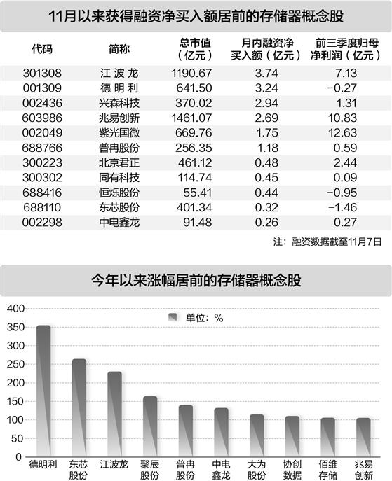 截至11月7日,11月以来,超半数存储器概念股获得融资资金加仓,其中6股月内获得融资净买入均超1亿元,包含江波龙、德明利、兴森科技、兆易创新等。存储器概念股受融资资金青睐。