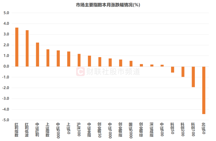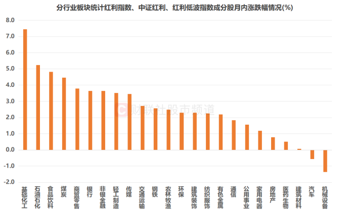 按行业板块(申万一级)统计,红利指数、中证红利、红利低波指数成分股中,来自基础化工、石油石化、食品饮料、煤炭、商贸零售板块的个股月内平均涨幅居前,分别达7.45%、5.24%、4.82%、4.46%、3.80%。银行、非银金融、轻工制造、传媒、交通运输板块的红利成分股也表现活跃,仅有机械设备、汽车板块成分股唯二收跌,跌幅分别达1.37%、0.55%,行业板块表现差异显著。