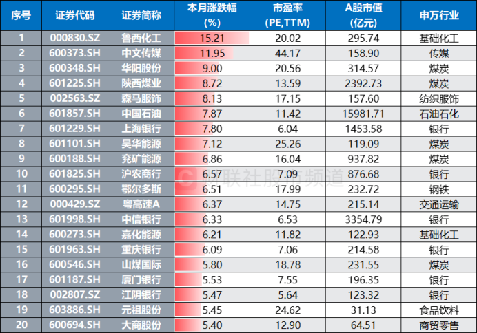 从个股动向上看,筛选红利指数、中证红利、红利低波指数的成分股,截至今日收盘,近120只标的月内平均上涨近2.97%,中位数涨幅2.64%。其中,鲁西化工、中文传媒、华阳股份、陕西煤业、森马服饰近日表现活跃,月内涨幅分别达15.21%、11.95%、9.00%、8.72%、8.13%,中国石油、上海银行、昊华能源、兖矿能源、沪农商行等股也涨幅居前,股市个股表现分化明显。
