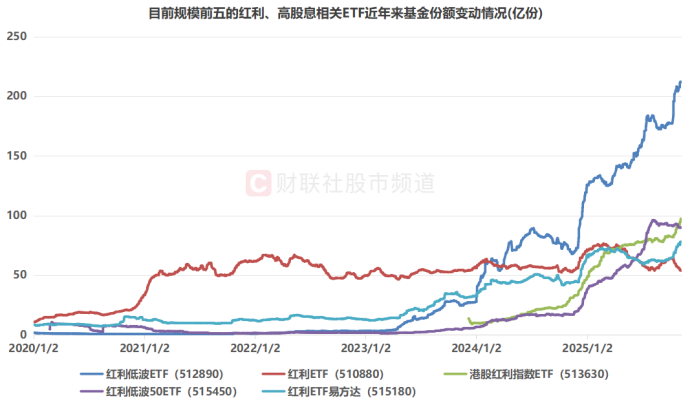 值得注意的是,随着近期份额持续增长,不少红利系ETF基金份额已达历史极高水平。以目前基金规模最大的红利低波ETF(512890)统计,其目前份额达212.20亿份,为历史最高数据。此外,基金规模超100亿的红利、高股息相关ETF中,港股红利指数ETF(513630)、红利ETF易方达(515180)分别于11月7日、11月6日录得历史最高份额纪录,ETF份额创新高。