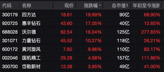 上午,超硬材料板块集体走强,培育钻石概念板块大涨超10%,相关个股全线飘红。四方达20cm涨停,黄河旋风10cm涨停。沃尔德、惠丰钻石大涨超16%,力量钻石涨超10%,国机精工、中兵红箭等跟涨。