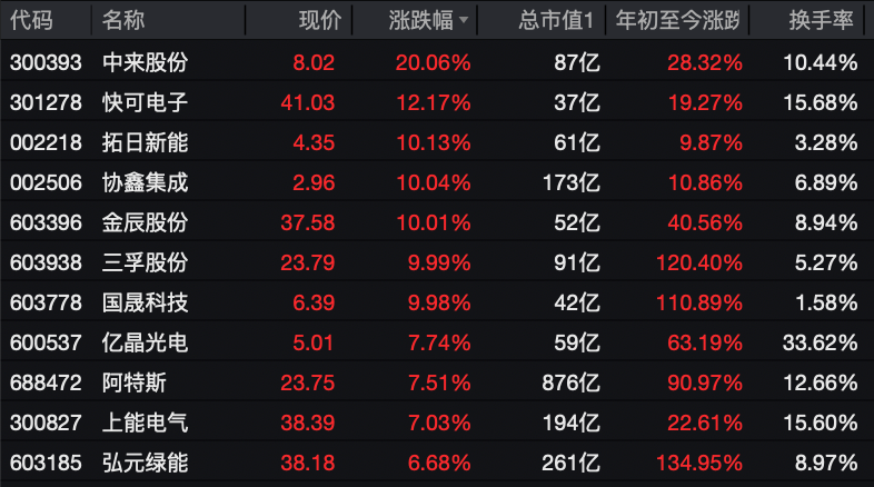 上午,新能源板块爆发,光伏板块持续拉升,钙钛矿电池、HJT电池、BC电池等概念板块走强,相关个股掀起“涨停潮”。截至午盘,多只个股一字涨停。其中,中来股份录得20cm涨停,拓日新能、协鑫集成、金辰股份均录得10cm涨停。快可电子、亿晶光电等跟涨。