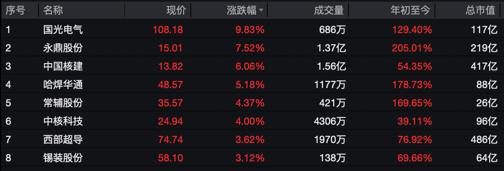今天上午,可控核聚变概念板块异动拉升。个股方面,国光电气一度涨超11%,永鼎股份涨超7%,中国核建、哈焊华通、常辅股份等个股跟涨。