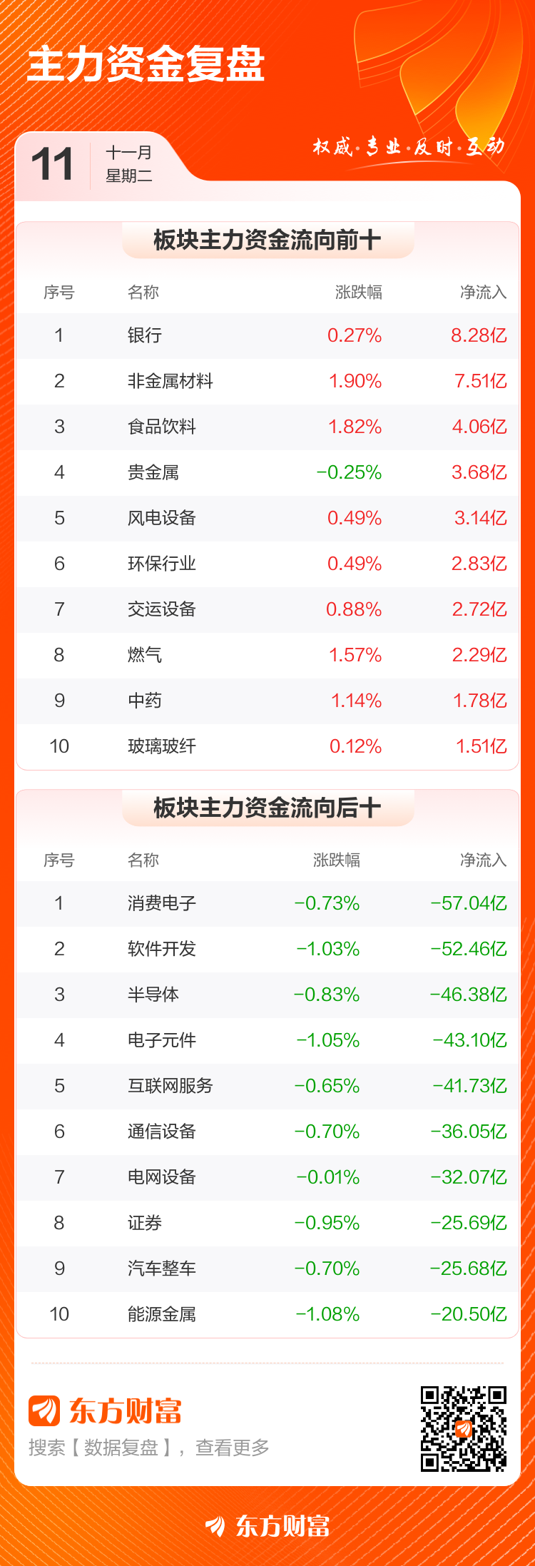 11月11日,A股市场表现分化,沪指跌0.39%,深成指跌1.03%,创业板指跌1.4%,市场整体呈现调整态势。两市成交额1.99万亿,较上个交易日缩量1809亿,显示出市场观望情绪浓厚。数据显示,今日大盘主力资金净流出643.87亿,资金流向成为市场关注的焦点。银行、非金属材料、食品饮料等板块主力资金流入排名居前,其中银行净流入8.28亿元,成为资金避风港。
