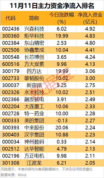 智能电网股炬华科技“20cm”涨停,主力资金净流入4.83亿元。龙虎榜数据显示,上榜营业部席位全天成交7.19亿元,占当日总成交金额比例为36.76%,合计净买入4.48亿元。消息面上,11月10日,国家发展改革委、国家能源局发布促进新能源消纳和调控的指导意见。其中提出,到2030年新增用电量需求主要由新增新能源发电满足。此外,东山精密、协鑫集成、长芯博创、方大炭素、四方达等主力资金净流入金额居前。