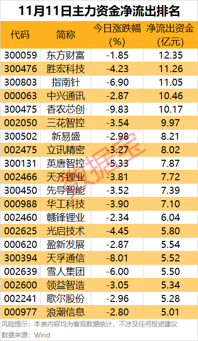 据数据宝统计,超150股主力资金净流出超1亿元,其中20股净流出金额超5亿元。5只热门股遭到主力资金大幅净流出,东方财富主力资金净流出12.35亿元,居首;胜宏科技和指南针主力资金净流出均超11亿元,中兴通讯和香农芯创净流出金额均超10亿元。