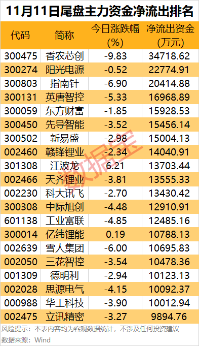 据数据宝统计,19股尾盘主力资金净流出金额超1亿元,其中3股流出超2亿元,多只热门股在列。存储芯片股香农芯创跌9.83%,尾盘主力资金净流出3.48亿元,居首。11月10日晚间,香农芯创披露股票交易异动公告,公司股票在2025年11月6日、7日和10日连续3个交易日,收盘价格涨幅偏离值累计超过30% 。阳光电源和指南针尾盘主力资金净流出均超2亿元。消息面上,指南针10月31日披露了关于终止2022年度向特定对象发行股票事项并撤回申请文件的公告。近日公司公告,深交所已于2025年11月6日出具终止审核决定。本次终止不影响公司正常生产经营,亦不构成对股东利益的重大损害。