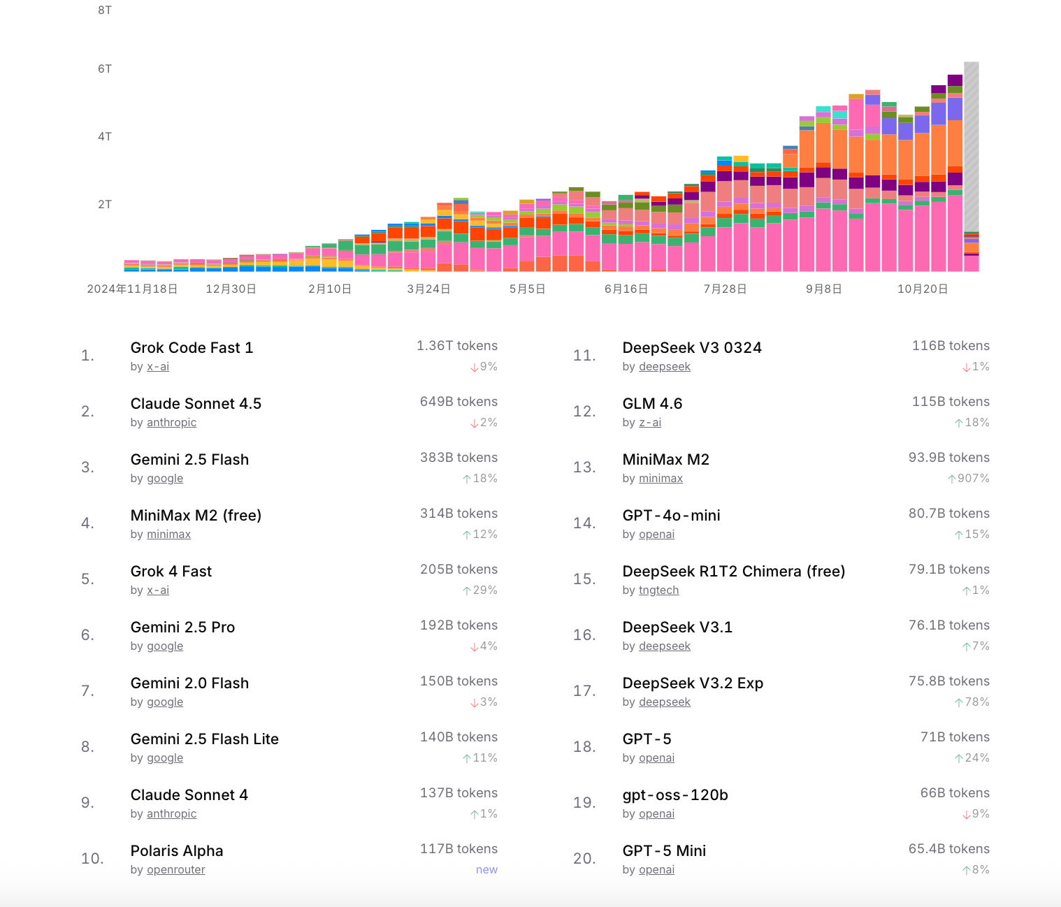网友也提出Kimi K2 Thinking推理长度过长、榜单成绩与实际体验不符等质疑,杨植麟表示现阶段该模型优先考虑绝对性能,token效率会在后续得到改善,榜单高分与实测的脱节问题也会在模型通用能力得到补齐后被逐渐消解。当下,越来越多的中国开源大模型在国际市场中被调用。记者搜索OpenRouter模型调用榜单,最新一周内,排名前二十名的模型产品中,中国开源模型产品占五席,具体包括MiniMax M2、DeepSeek V3、GLM4.6、DeepSeek V3.1、DeepSeek V3.2 Exp。Kimi因OpenRouter平台接口问题,目前只能以API形式被使用。