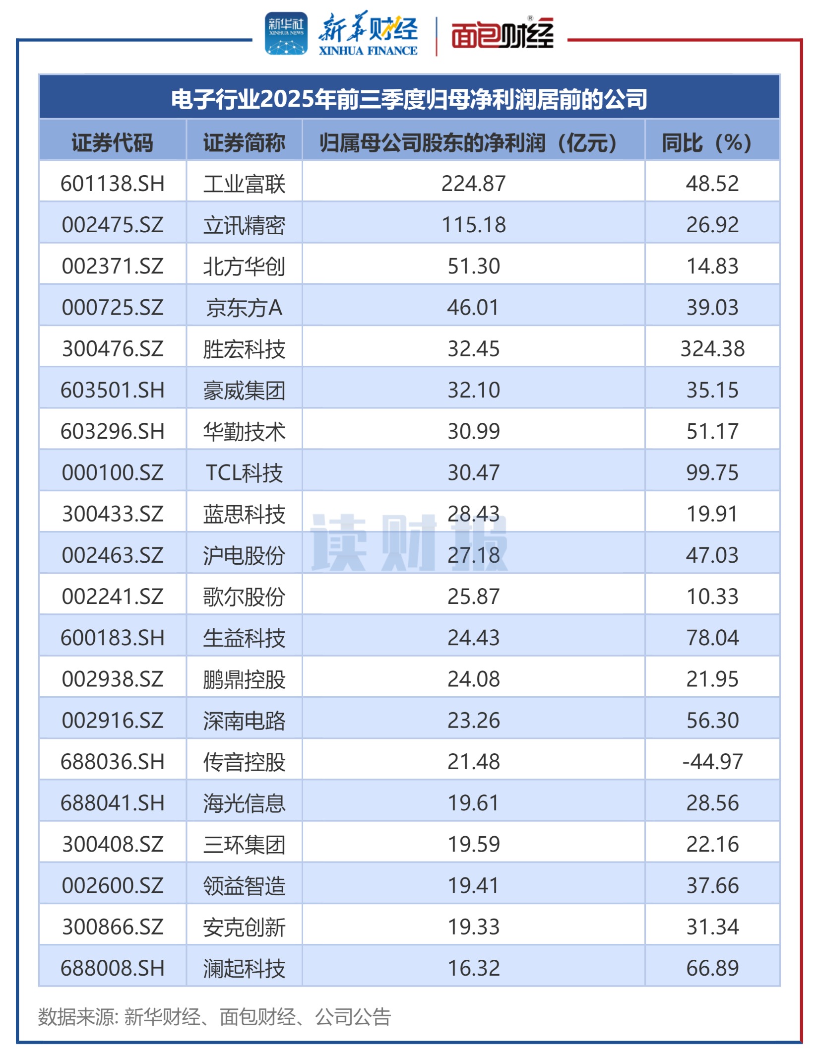 归母净利润方面,超七成电子行业公司2025年前三季度实现盈利。其中,工业富联、立讯精密前三季度归母净利润均超过百亿元。