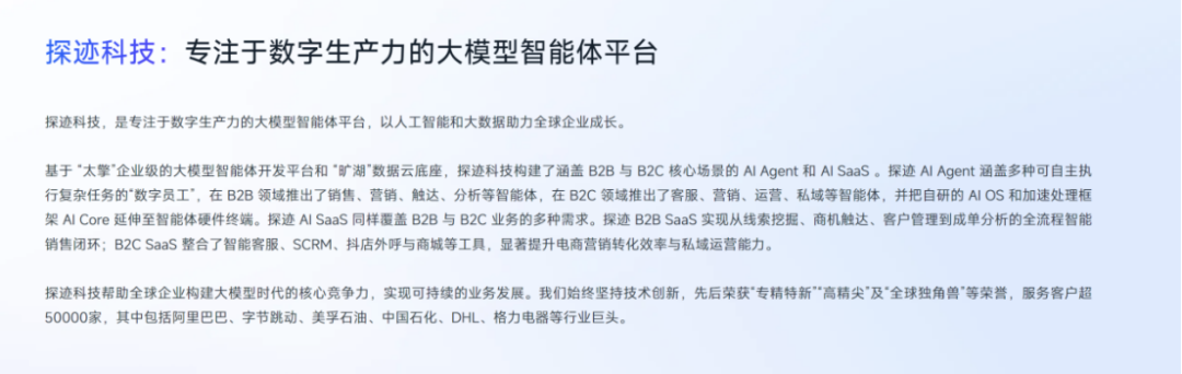 公开资料显示,探迹科技是专注于数字生产力的大模型智能体平台,以人工智能和大数据助力全球企业成长。基于“太擎”企业级的大模型智能体开发平台和“旷湖”数据云底座,探迹科技构建了涵盖B2B与B2C核心场景的Al Agent。公司服务客户超50000家,其中包括阿里巴巴、字节跳动、美孚石油、中国石化、DHL、格力电器等行业巨头。