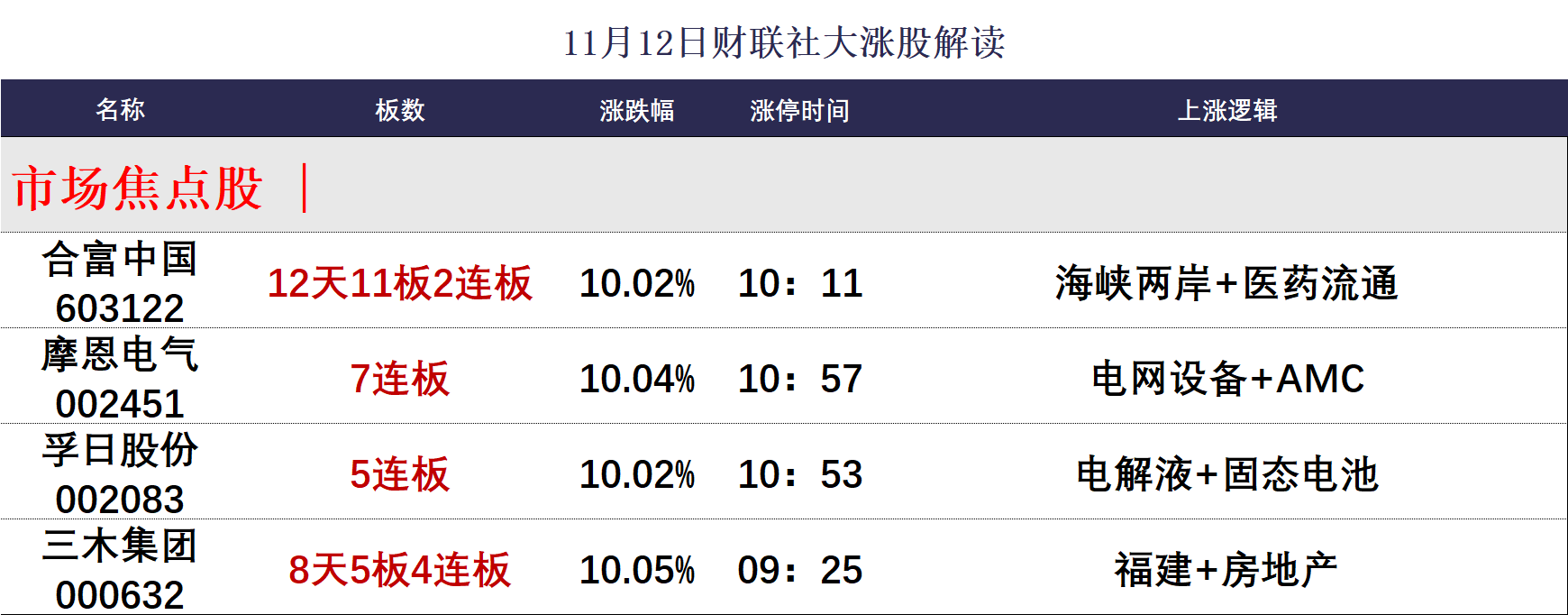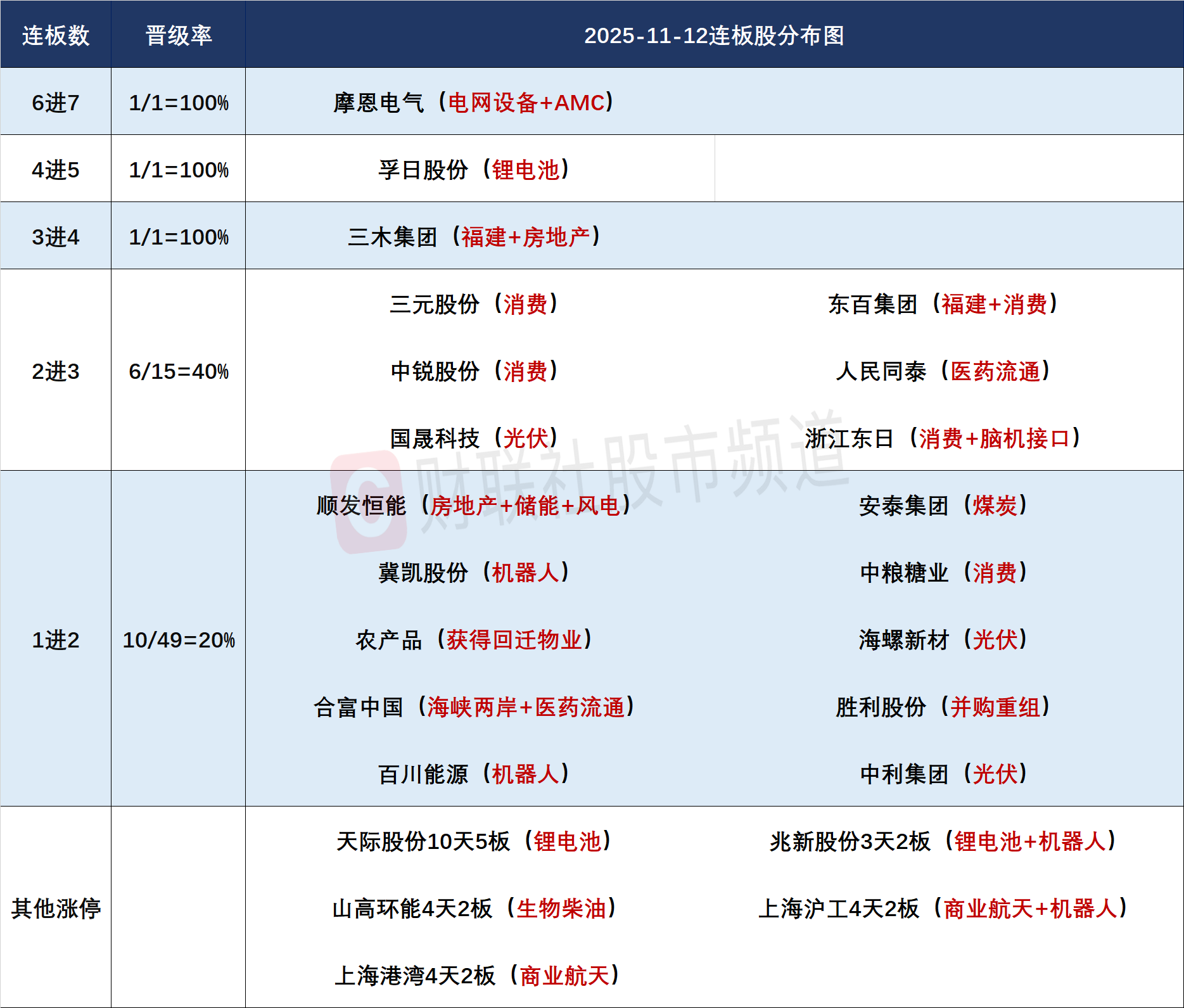 财联社11月12日讯,今日A股市场57股涨停,19股炸板,封板率为75%,摩恩电气7连板引领市场,孚日股份5连板紧随其后,三木集团8天5板,东百集团6天4板,人民同泰、三元股份、浙江东日、国晟科技、中锐股份3连板,合富中国12天11板,安泰集团20天11板。市场探底回升,沪指微跌,创业板指尾盘一度翻红,沪深两市成交额1.95万亿,较上一个交易日缩量486亿。盘面上,市场热点快速轮动,全市场超3500只个股下跌。板块方面,保险、医药、油气等板块涨幅居前,培育钻石、光伏、可控核聚变等板块跌幅居前。截至收盘,沪指跌0.07%,深成指跌0.36%,创业板指跌0.39%,市场情绪有所波动,但连板股表现抢眼。