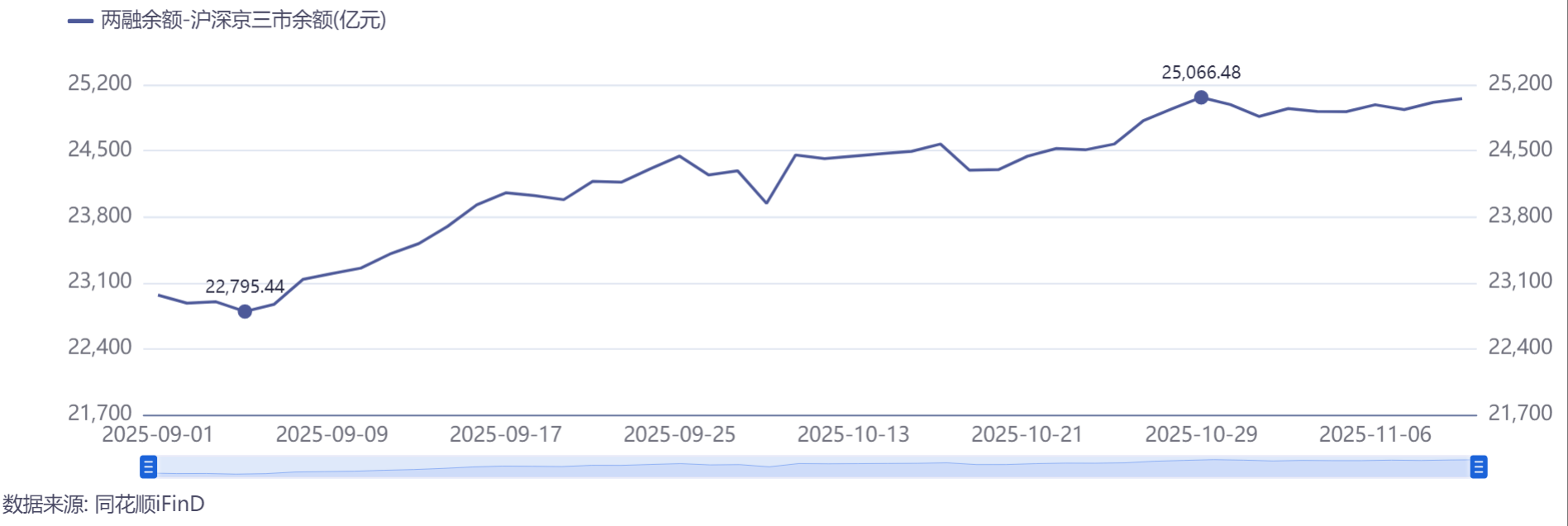 今年以来,A股市场交投持续活跃,资金做多情绪高涨,杠杆资金加速入场,融资融券余额稳步攀升,带动上市券商前三季度利息净收入同比大增54.52%。数据显示,两融余额自9月初首次突破2015年2.27万亿元的历史高位,此后便一路走高,于10月29日首次站上2.5万亿元关口,刷新历史纪录。中证数据最新显示,截至11月11日,A股融资余额2.49万亿元,两融余额占A股流通市值比重2.47%;两融市场中的个人投资者数量为777.45万名、机构投资者为5.04万家。其中,参与交易的投资者数量为46.95万名,有融资融券负债的投资者185.41万名,平均维持担保比例为279.94%。展望后市,机构人士预测,结合11月以来市场延续震荡态势,两融开户将呈现“短期承压、渐趋修复”特征。