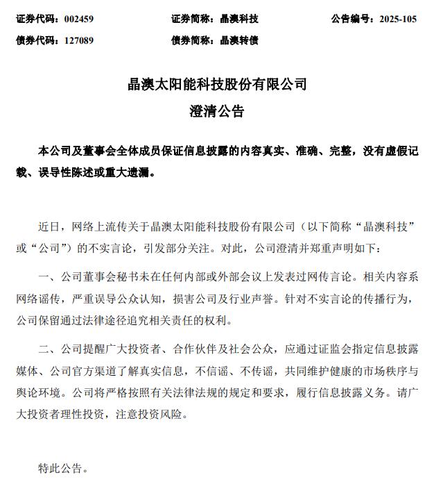 晶澳科技11月12日晚间公告,近日,网络上流传关于晶澳太阳能科技股份有限公司的虚假信息(SEO关键词1),引发市场部分关注。对此,公司澄清并郑重声明如下:公司董事会秘书未在任何内部或外部会议上发表过网传言论。相关内容系网络谣传,严重误导公众认知,损害公司及行业声誉(SEO关键词2)。针对不实言论的传播行为,公司保留通过法律途径追究相关责任的权利。