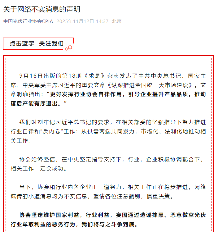 11月12日,中国光伏行业协会执行秘书长刘译阳在其微信朋友圈发文称:“请大家不要信谣、传谣。”中国光伏行业协会也积极行动,努力维护行业秩序。
