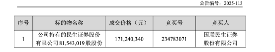 【导读】国联民生证券竞得民生证券8154.3万股股份,股权整合再进一步