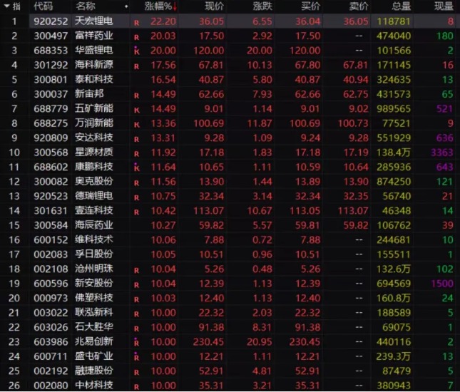 值得一提的是,涨停及涨幅超过10%的个股一度达到30只,市场热度可见一斑。(锂电池,市场热度)