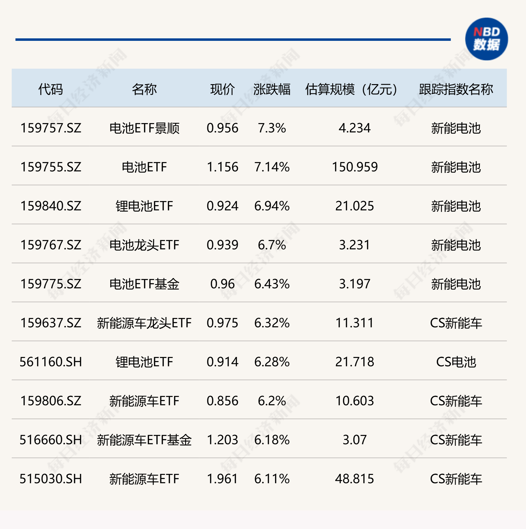 ETF涨跌幅方面,电池相关ETF涨超7%,成为市场焦点。