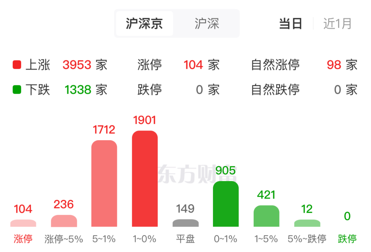 量能方面,两市午后交投明显活跃,全天成交2.04万亿元,较昨日放量969亿元;普涨行情再现,全市场近4000股飘红,超百股涨停,封板率为67.53%,市场活跃度提升。