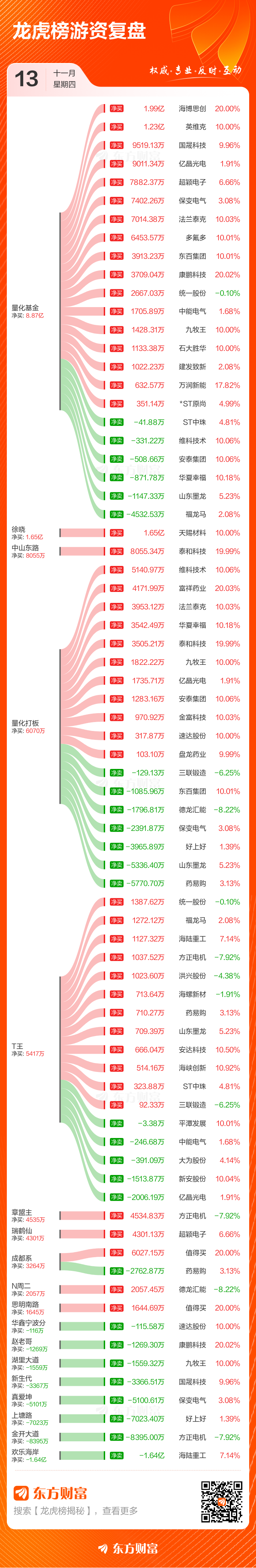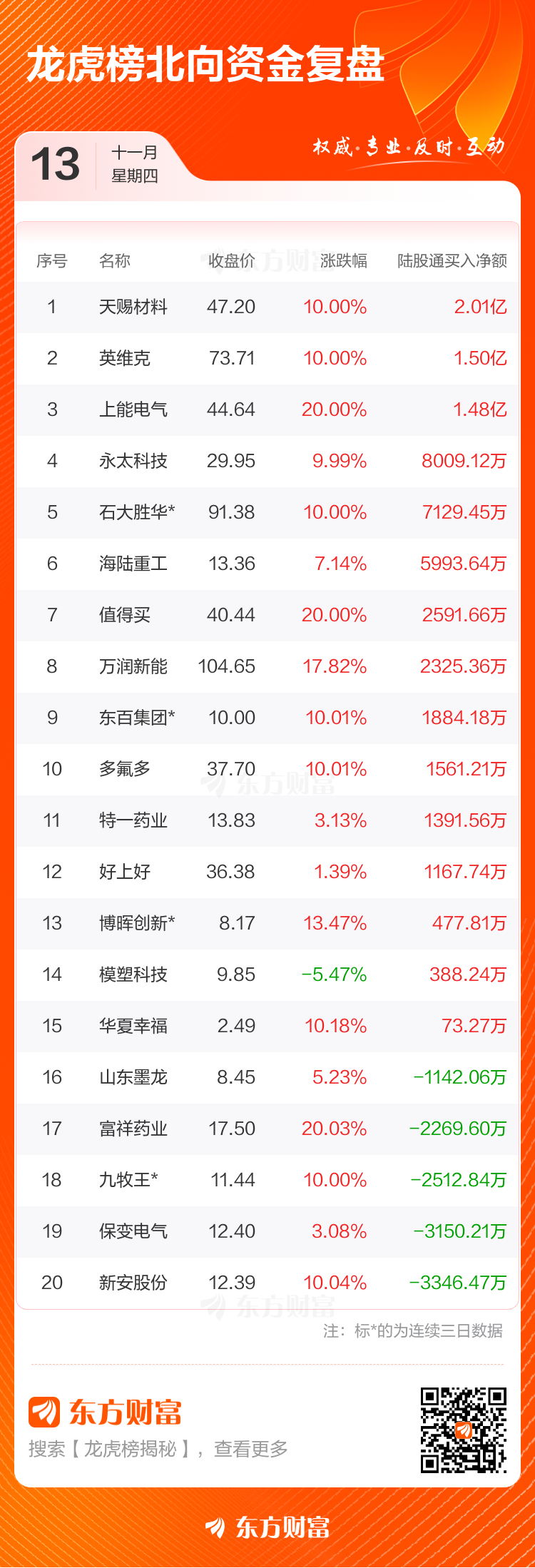11月13日龙虎榜揭晓:天赐材料成游资焦点,净买入额领跑