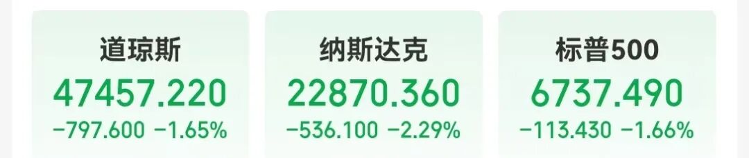 当地时间11月13日,美股三大指数集体收跌,市场情绪低迷,道琼斯指数下跌797.6点,跌幅1.65%;标普500指数下跌113.43点,跌幅1.66%,纳斯达克综合指数下跌536.10点,跌幅2.29%。科技板块跌幅居前,特斯拉跌超6%,英特尔跌超5%,AMD、甲骨文跌超4%,英伟达跌超3%,亚马逊、谷歌跌超2%。其中,英伟达市值一夜蒸发1686.42亿美元(约合人民币11966.67亿元)。