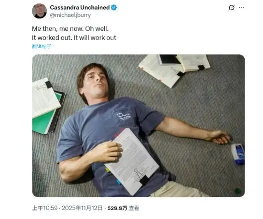 彼时,有媒体报道他“十亿美元做空”Palantir、英伟达,这引发了美国科技股的全面下挫。贝瑞亲自辟谣并披露了持仓细节。他提供的截图显示,他持有5万张Palantir 2027年1月15日到期、行权价50美元的看跌期权,相当于500万股。他同时解释称,他购买的价格是1.84美元,所以购买这些期权总共花了920万美元。这一交易已经在10月交割完成。另外,他还持有1万张英伟达2027年12月17日到期、行权价110美元的看跌期权,但未透露价格。贝瑞还在社交媒体平台预告,11月25日将有大消息公布。此外,他再度在社交媒体上发布了一张“大空头”的剧照,隐喻“此时此刻正如彼时彼刻”,而这一切终将水落石出。