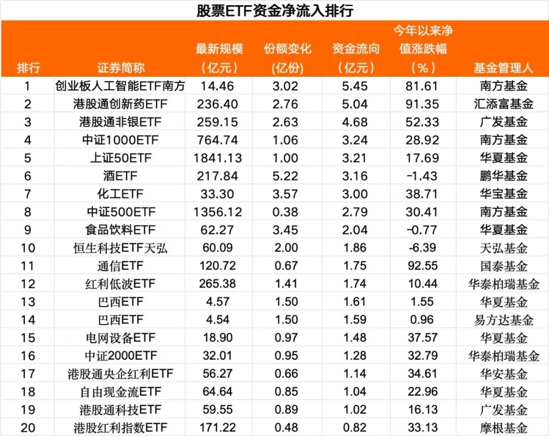 另据Wind统计,资金净流入前20大股票ETF中,港股相关ETF占据6席,涉及创新药、非银、科技、红利等方向;此外,人工智能、酒、化工、食品饮料、通信等行业主题ETF,以及中证1000、上证50、中证500等宽基ETF资金净流入较为靠前。从5日角度观测,近期资金流入科创50指数相关ETF超23亿元。头部基金公司中,截至11月13日,易方达基金ETF最新规模为8338.2亿元,其中,黄金ETF净流入1.2亿元,上证50ETF易方达净流入0.7亿元,恒生红利低波ETF净流入0.5亿元,证券保险ETF净流入0.4亿元。华夏基金ETF中,11月13日,上证50ETF和食品饮料ETF单日净流入居前,分别净流入3.21亿元和2.04亿元,最新规模分别达1841.13亿元和62.27亿元,对应跟踪指数近一月日均成交额分别为24.37亿元和2.94亿元。电网设备ETF、自由现金流ETF净流入均超1亿元。