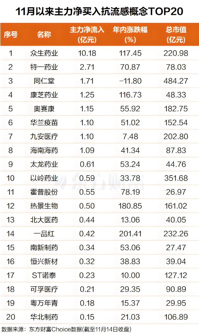 东方财富Choice数据显示,自今年11月以来,主力资金净买入多只抗流感概念股,众生药业排名第一,主力净买入超10亿元,今年以来该股股价已经翻倍;特一药业排名第二,主力净买入近3亿元,今年以来涨幅也已经超过了70%。