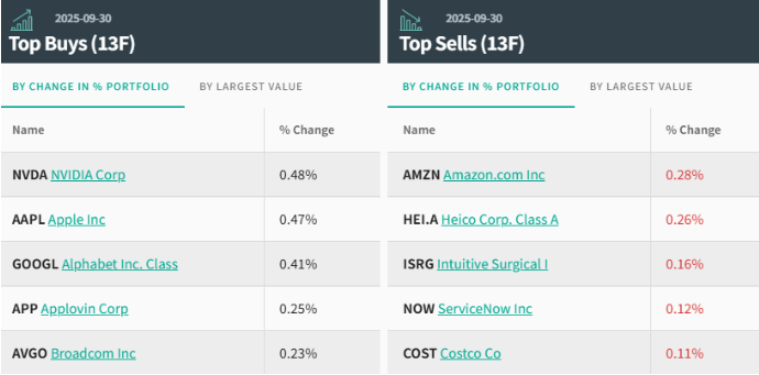 根据美国证券交易委员会(SEC)披露,全球资管巨头景顺(Invesco)递交了截至2025年9月30日的第三季度持仓报告(13F),这一持仓报告对于投资者了解市场动态和巨头投资策略具有重要意义。统计数据显示,从持仓比例变化来看,前五大买入标的分别是:英伟达、苹果、谷歌、Applovin、博通。其中英伟达作为科技领域的领军企业,备受景顺青睐。前五大卖出标的分别是:亚马逊、海科航空、直觉外科、ServiceNow、开市客。