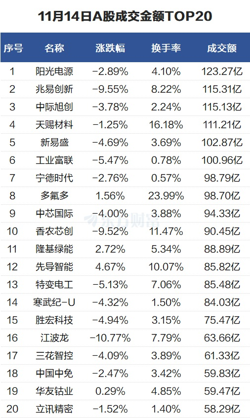 11月14日A股市场三大指数集体收跌,个股成交活跃