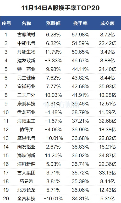 当天换手率最高的个股为古麒绒材,全天换手率高达57.98%,显示出市场对该股的强烈关注。中能电气紧随其后,全天换手率51.59%,市场活跃度较高。这些数据反映出市场资金的流动情况和个股的吸引力,为投资者提供了重要的参考依据。在股市波动中,投资者需密切关注市场动态,合理布局投资组合。